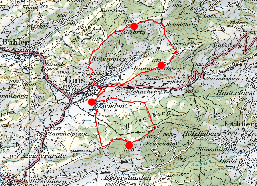 Das Appenzeller Land war bisher, und ich gestehe es freimütig, zu Unrecht ein weisser Fleck auf unserer Landkarte. Zu römischen Zeiten hätte auf diesem für uns weissen Fleck «Hic sunt leones, hier leben Löwen» gestanden, wie um zu rechtfertigen, warum man sich noch nie dorthin gewagt hat. Einen solchen Grund gibt es im Appenzeller Land nicht. Und trotzdem hat uns nur der Zufall nach Gais und auf den Gäbris bzw. den Höch Hirschberg geführt, weil sich eine Schneeschuhtour auf die Berra im Kanton Freiburg zerschlagen hat. Im Internet sind wir per Zufall auf das Gästehaus Bären in Gais gestossen und haben dort nicht nur ein heimeliges Zimmer mit Gartenterrasse und reichhaltigem Frühstück, sondern auch eine herzliche und zuvorkommende Bedienung damals durch die Familie Willi gefunden. Bei der Planung der zwei kleinen Winterwanderungen stiegen in mir Erinnerungen auf an ein Ferienlager auf dem Schwäbrig in der dritten Primarschulklasse; ich war also schon einmal vor langer Zeit im Appenzeller Land und begann zu rechnen, das war vor 52 Jahren!