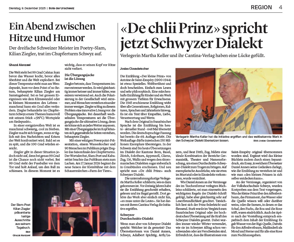 „De chlii Prinz“ spricht jetzt Schwyzer Dialekt Verlegerin Martha Keller und ihr Cantina-Verlag haben eine Lücke gefüllt Zeitungsartikel Bote der Urschweiz 09.12.2025