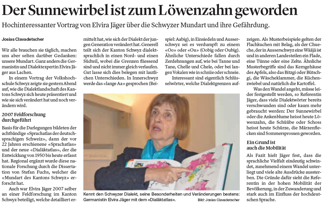 Der Sunnewirbel ist zum Löwenzahn geworden Hochinteressanter Vortrag von Elvira Jäger über die Schwyzer Mundart und ihre Gefährdung. Zeitungsartikel Bote der Urschweiz 19.11.2025